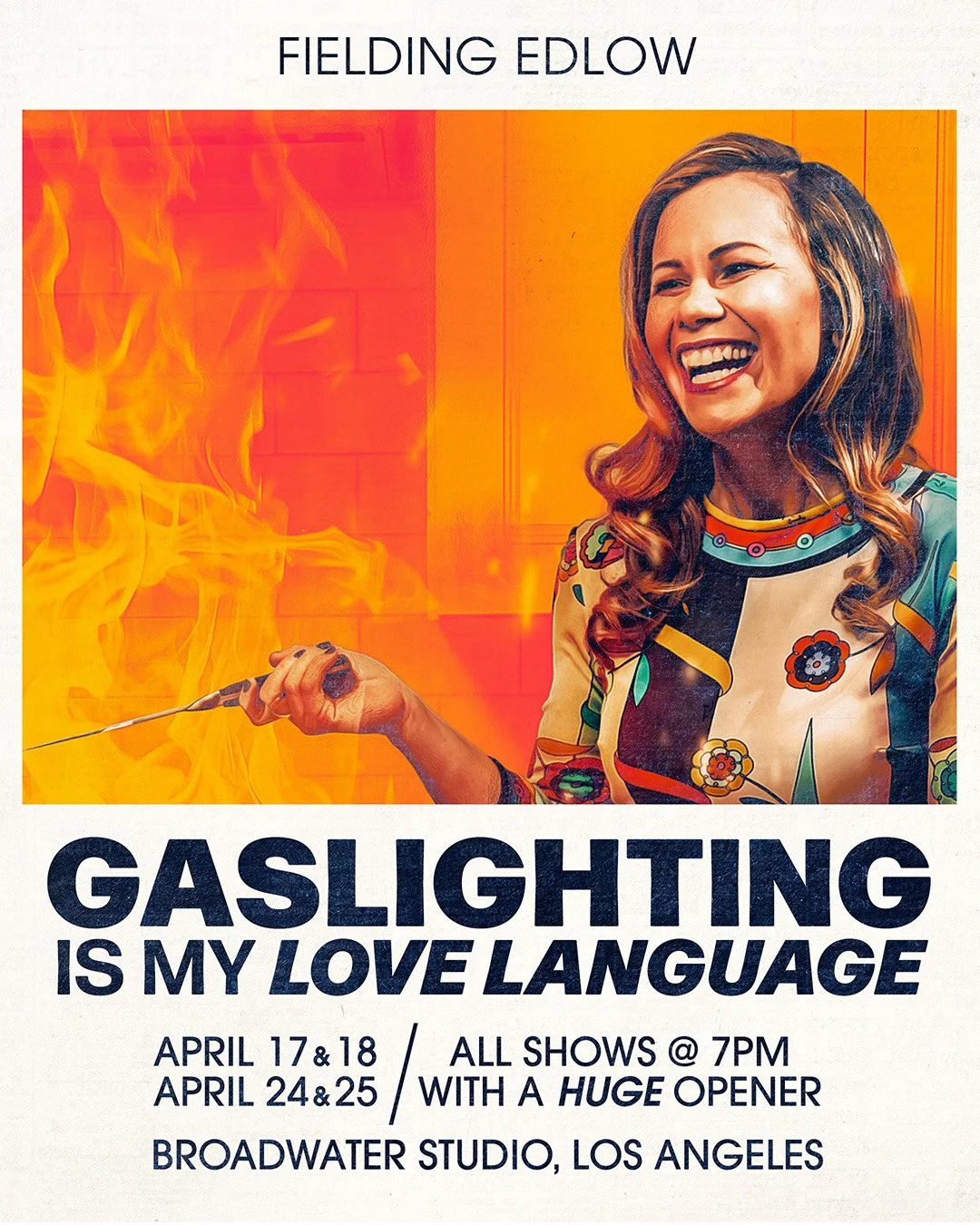 Fielding Edlow is a stand-up comedian, writer, and creator/star of award-winning digital series Bitter Homes and Gardens. She has performed stand-up at Edinburgh, Leicester, Boston Comedy Festival and hosted her sold-out cult show Eat Pray Fuck for 6 years at the Hollywood Improv. She voiced the “Roxie” on Bojack Horseman including a slew of other characters (but was politely asked not to do “accents”) Her first solo show, Coke-Free J.A.P. had two sold-out runs in LA before being developed as a half-hour pilot at Showtime. Her plays have been produced/workshopped with Naked Angels, New York Stage & Film, Comedy Central Stage, IAMA, and Circle X Theatre. She’s currently on a very haphazard international tour for her latest solo show Gaslighting is My Love Language.